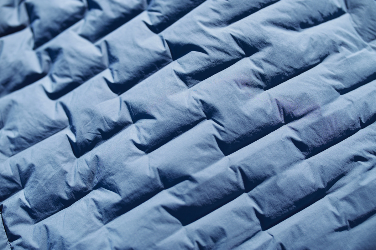 一般的なダウンは、生地を縫い合わせたり、溶着剤で貼り付けたりしてバッフル(ダウンの部屋)をつくります。いっぽうMOUNTAIN HARDWEARは、表地と裏地を“織り込む”ことでバッフルを形成する「スーパーDS構造」を採用。開発に10年をかけ、ようやく製品化されたものです。縫い目や貼り付けに頼らないぶん、羽毛が抜けにくく、羽毛が偏って生まれる“コールドスポット”もできにくいため、暖かさを保ちやすいのが特長。さらに構造として伸縮性も確保できるので、行動中の動きに追従しやすい着心地につながっています。