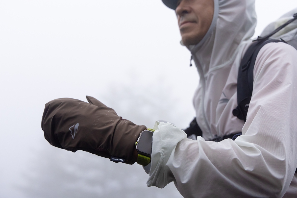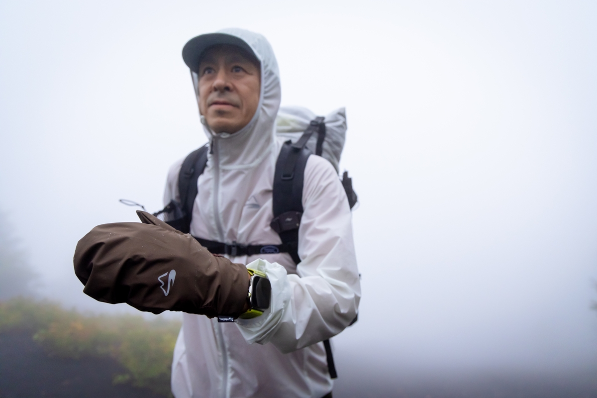 ファストトレイルグローブ2.0が活躍するのは、雲のなかに入って、しとしと雨に打たれたとき。さらに雲といっしょに吹いてくる風を防ぎたいときだ。