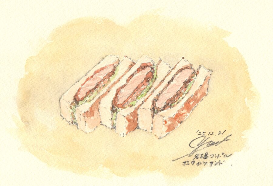 迷いなくポークカツサンドとアイスコーヒー(街歩きは暖房の効いた場所が多くて汗をかく)を注文する。父曰く「コンパルのコーヒーはカチッとしている」。名古屋の喫茶店のコーヒーは濃いめなのが特徴で、コンパルはその典型。アイスコーヒーはさらに濃いめに淹れられた熱々のコーヒーを自分で氷に注ぐもので、老舗喫茶店のこだわりを感じさせた。甘辛ソースとたっぷりのキャベツ、焼き目のついたパン、そしてジューシーなカツ。10年以上ぶり?で食べたカツサンドは、記憶の味そのままであった。