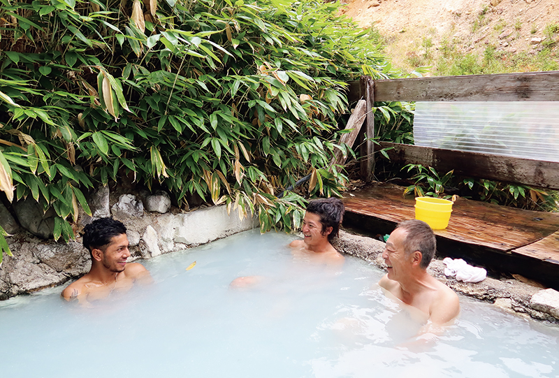 周囲が壁で覆われた露天風呂。別に女性専用風呂もあり、こちらは混浴扱い。ときどき女性も入浴しているようだが、実質的には男性用だ。