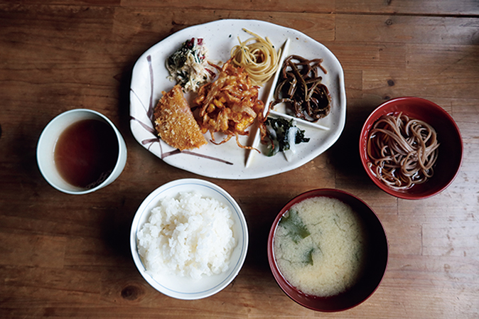 【夕食】この日は、かき揚げにカツ、スパゲティサラダなどがおかず。冷たいとろろソバもうれしい。ネパール人のスタッフも働いており、ときにはネパールカレーが出ることもあるという。