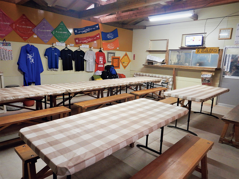 宿泊者の食堂だが、食事の時間以外は開放している。軽食が食べられたり、風呂上がりにビールで宴会をしたり。売店が併設し、オリジナルTシャツや手ぬぐいなども購入可能だ。