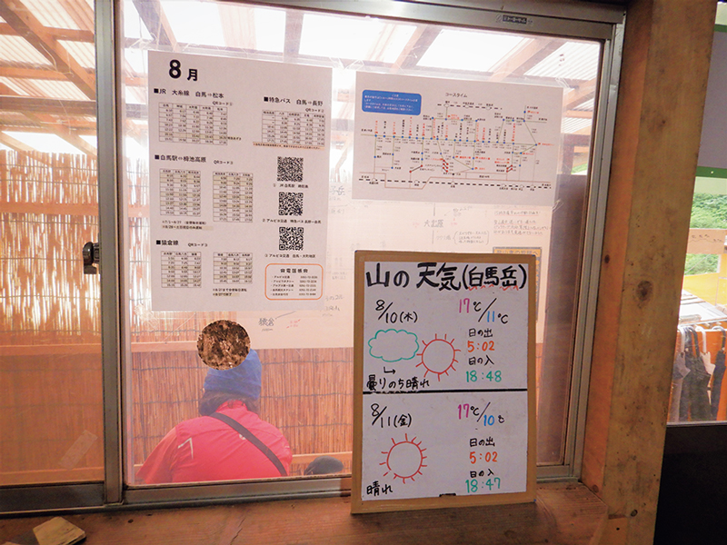 毎朝白馬岳の気温と天気が表記されるので携帯電話の電波がない登山者にはありがたい情報が手に入る。下山時の時刻表や交通アクセスも張り出されている。