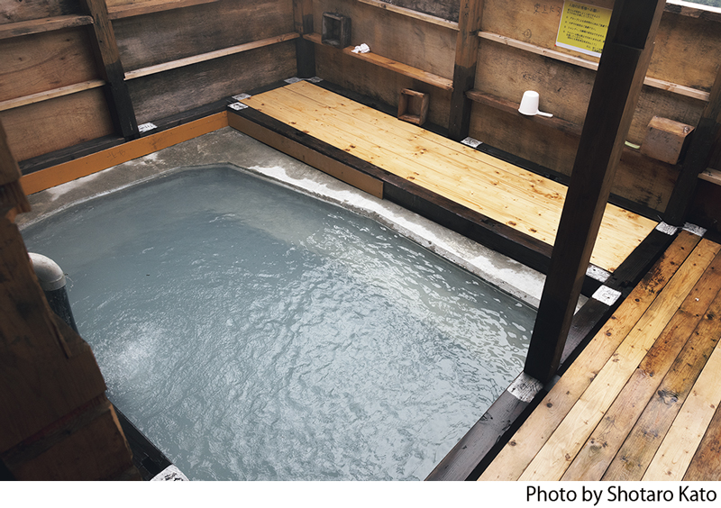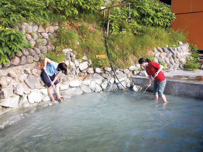 宿泊者が出ていったあとに毎朝掃除する。湯舟のなかに隠された栓を開き、お湯を入れ替える。露天風呂は浴槽からお湯が湧いているためすぐに溜まる。