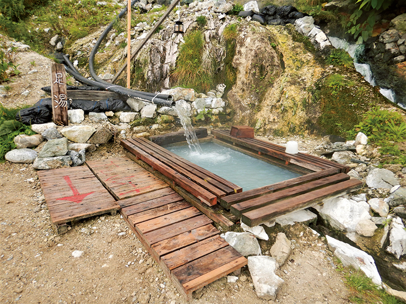 小屋の大きな特徴は標高2,100mに湧く温泉だが、数年前に露天風呂の浴槽の床に穴が空き、お湯が流出し登山道下に空洞ができてしまった。そのためしばらく休業し、浴槽に鉄骨を入れる工事を行ない営業を再開したのが2022年だ。見た目としては変わりないが、パワーアップした温泉を楽しめるはずだ。