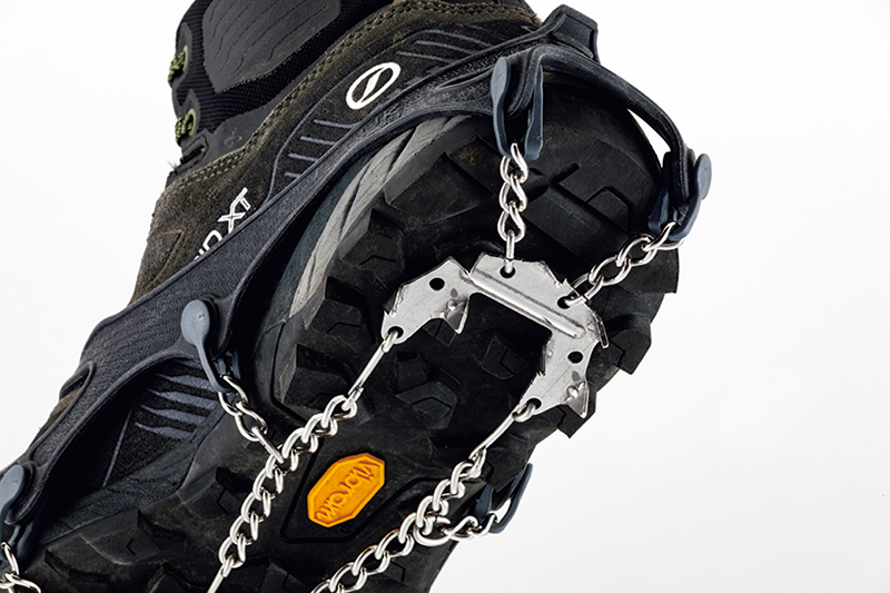 本格的な12本爪クランポンを使うほどの斜度や雪の量ではないが、雪や氷が道を覆っていて、滑り止めが必要。そんなときに活躍するのがチェーンスパイクだ。これまでは爪が4~6本の軽アイゼンが主流だったが、装着のしやすさ、軽さなどが支持され、いまでは多くの登山者が使用するようになっている。