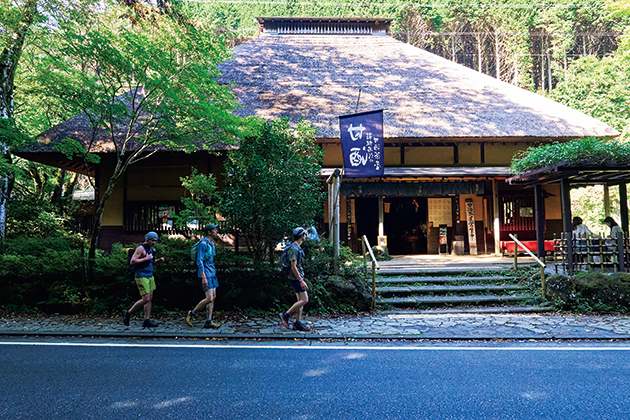 喘ぎながらそそり立つ壁を越えて、やっとの思いで屏風山に到着。次の目的地は、江戸の時代から続く甘酒茶屋である。山道を下ってから車道を少し進むと、茅葺き屋根の古めかしい建物が見えてきた。