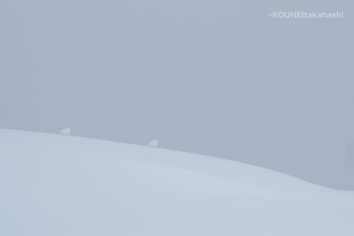 今回の1枚は、遠間から2羽のライチョウが雪原を歩む場面を写したものだ。この日、これ以上の接近ができなかったのでこの写真を帰宅後に確認するまで曖昧だったのだが、オスメスのペアであった。繁殖行為をしているわけではないので性急につがいだと判定することはできないが、日を改めて再会した際もこの2羽で暮らしていた。またその後も、幾度となくこのペア以外にもオスメスのペアを確認している。このように、それまでオスメス別々に越冬すると定義されていたものを覆す記録を納めることがきたのは生態学的にも大変有意義な発見だったといえよう。