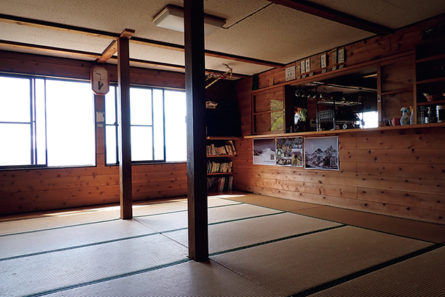 約20畳の畳敷きには、テレビや本があり、疲れた体をゆっくり休められる。窓からは槍ヶ岳方面が見渡せる。食事時にはテーブルが並べられて、食堂に早変わり。