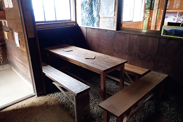 玄関を入って受付前にある自炊スペース。火器はガスバーナーのみ使用可能だが、取り扱いには十分に注意しよう。限りあるスペースのため譲り合いが大切。