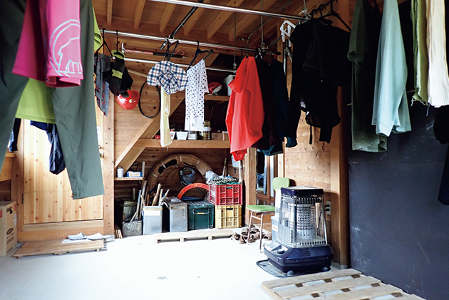 広い乾燥室には、外からも中からもアクセス可能。大型のストーブや、除湿器を備えているため、濡れたウエアでもしっかり乾かせる。