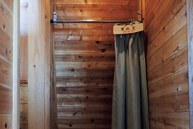 小屋のデッドスペースにバーとカーテンを付けて活用した、アイデアが光る更衣室。スペースは最小限のため、必要な物だけを持って入ろう。