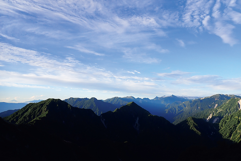 針ノ木小屋からの景色がなんといってもすばらしい。小屋の前に立つと、北アルプス南部方面の山々が見渡せて、槍ヶ岳もその穂先をのぞかせている。西に目を向ければ、雄大な富士山の姿が。ふと眼下に目をやると、黒部湖が広がっている。まさに大パノラマだ。