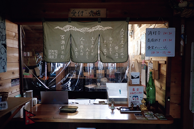 野菜あんかけがのった針ノ木ラーメン、缶ビールやジュースを販売。お土産には手ぬぐいやピンバッジを。
