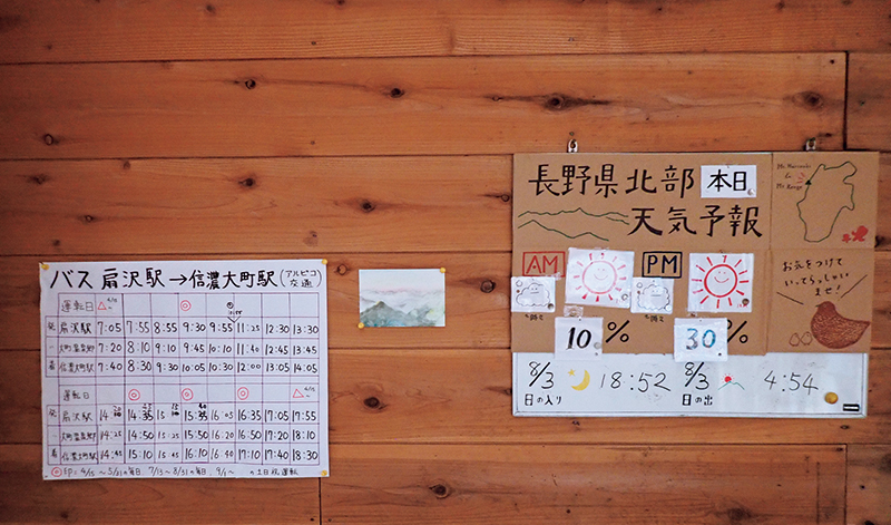 小屋の中には、バスの時刻表と天気予報が手書きで掲示されている。