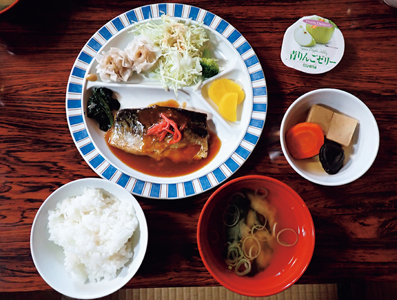 サバの煮つけ、シュウマイ、サラダ、たくあん、煮物、ご飯、味噌汁と、ボリューム満点な夕食。ご飯は、おかわりができる。デザートに小さなゼリーが付いていてありがたい。