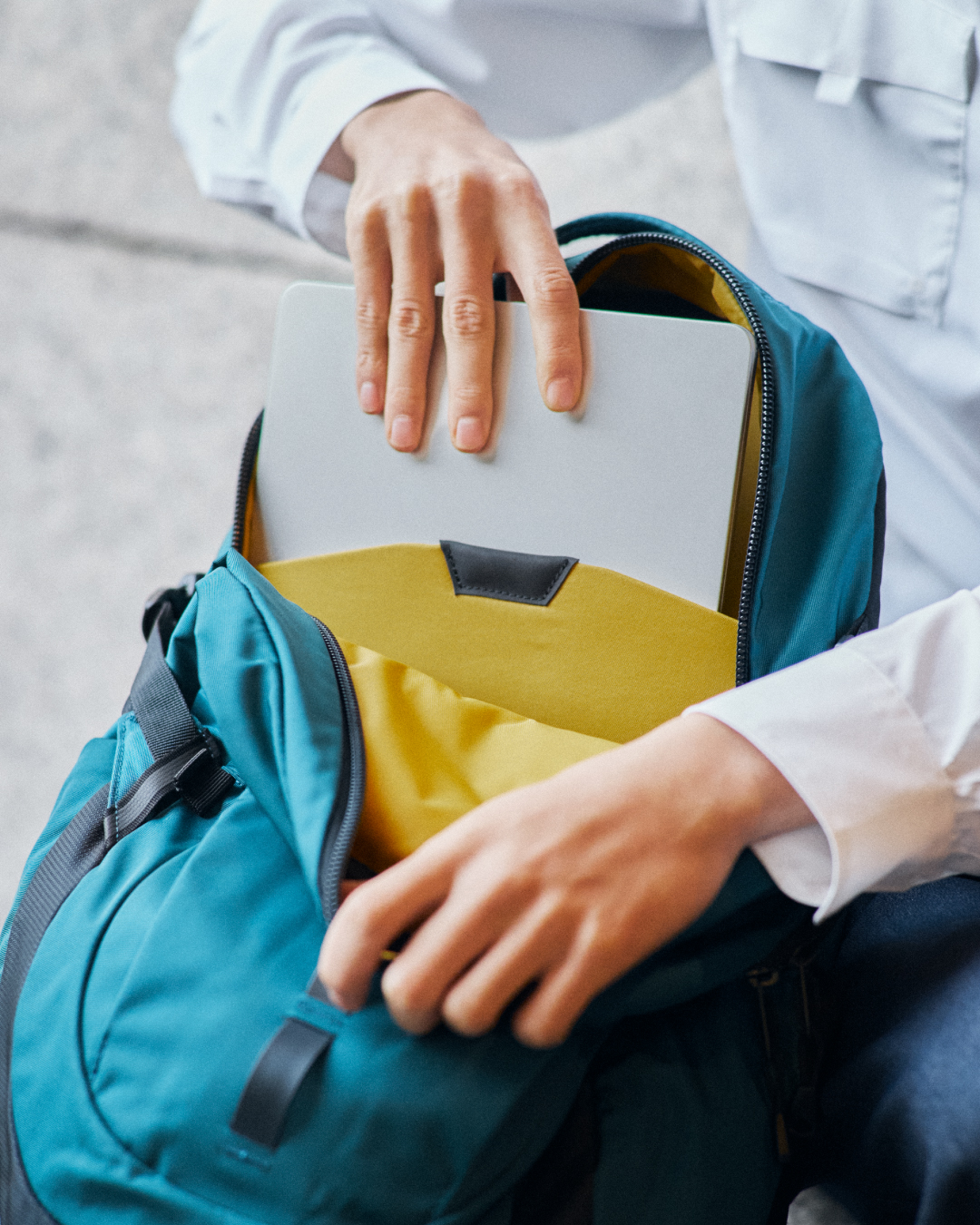 新モデルはシルエットの変化にも注目です。ボトムに丸みを持たせたことで、背負ったときの印象がよりスマートでクリーンになり、オフィスカジュアルにも馴染む仕上がりになりました。また、PCスリーブは15インチ対応という点は旧モデルと同じながら、従来より固めのメッシュスリーブに変更することで、大型のノートPCやデジタルタブレットを入れたときの安定感が増しました。ほかにも、ストレッチ素材のサイドポケット、PFAS(有機フッ素化合物)不使用の撥水加工など、細部にわたって手が施されたリニューアルと言えます。