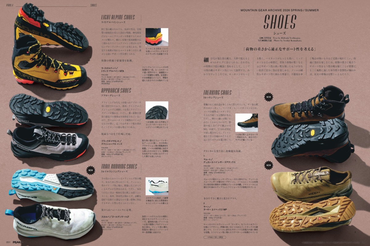 選ぶときの重要なポイントは、背負う荷物の重さや歩く地形に応じて、適切な設計とサポート性を備えたモデルを選ぶこと。トレッキングシューズ、ライトアルパインシューズ、アプローチシューズ、トレイルランニングシューズの4つのカテゴリーごとに特徴を整理しながら、最新モデルをご紹介しています。