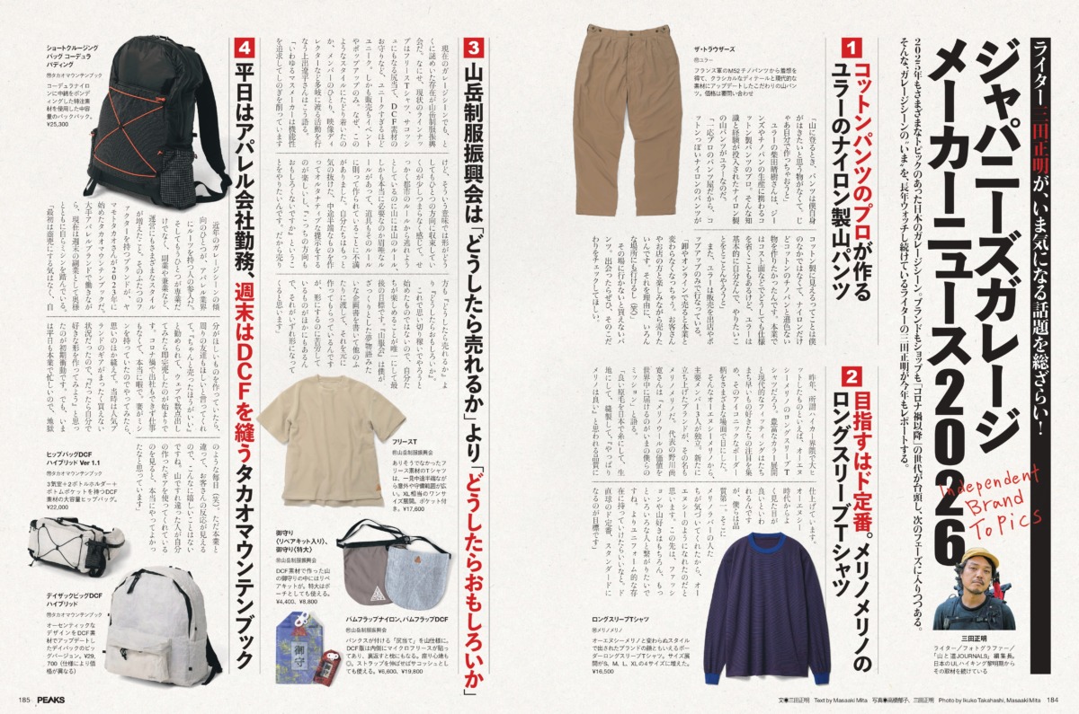 テーマは、日本のガレージメーカーの最前線。コロナ禍以降、MYOGや副業ブランドなど、登山ギアの作り手たちのスタイルはますます多様化しています。パンツ職人が作るナイロン製山パンツ、週末だけDCFギアを縫うブランド、売れるかどうかより「おもしろいかどうか」を優先する物作りなど、自由な発想から生まれたプロダクトとストーリーをレポートします~。