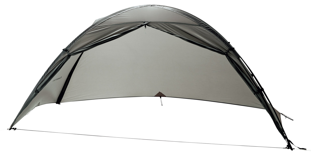 ▲フライシートにポールを通す構造のため、インナーテントなしでも自立する。単体でフロアレスシェルターとしても使えるほか、雨の日の撤収がとてもしやすいというメリットもある。