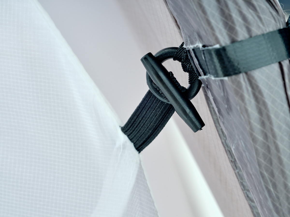 インナーテントはフライシートにトグルで吊り下げられている構造。フライシートの内側でインナーテントだけを外して収納することも可能なので、雨天時の撤収が効率的。