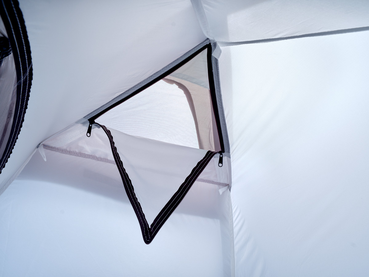 インナーテント天頂部にはファスナーで開閉できる換気用のメッシュパネルが設けられている。ランタンを吊したり紐を通したりすることができるループも備えられている。