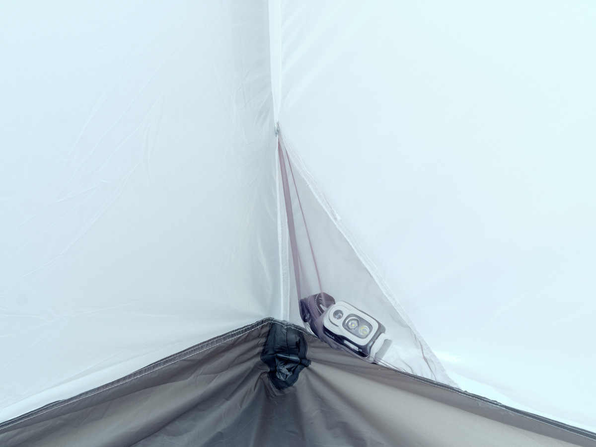居室内の下部には三角形状のメッシュポケットが付いている。ヘッドランプやメガネ、スマホなど、すぐに取り出したい身の回りの小物を収納しておくのに役立つ。