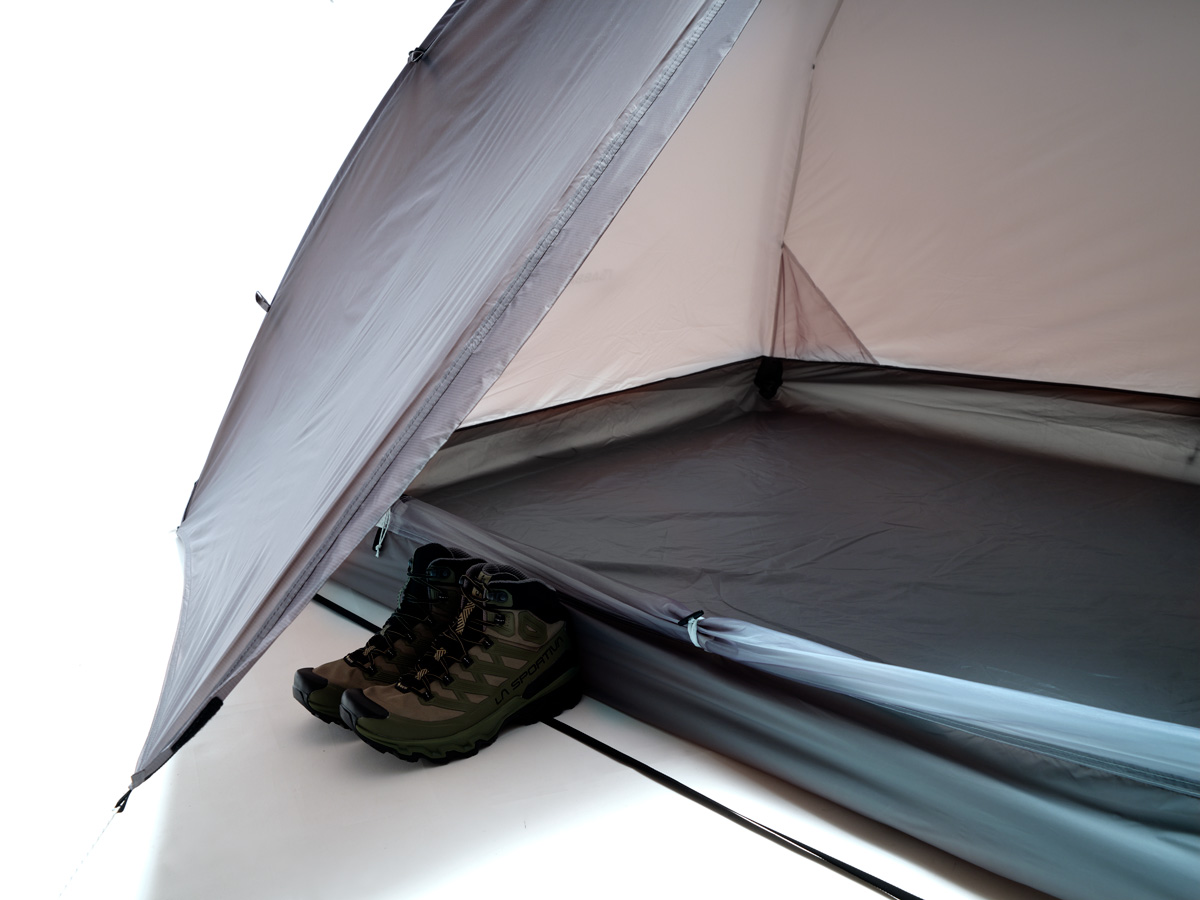 インナーテント出入り口の大きさはトップクラス。さらにフライシートの両側を巻き上げると開放感抜群の空間が現れる。天気がよく眺望がいいテント場での居心地は最高だ。