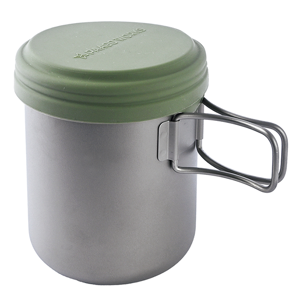 ソロ向けのチタンクッカー。110サイズのガス缶と小型バーナーを収納可能。密封性の高い独自設計のシリコンキャップでハンドルを固定でき、収納時のガタつきや中身の散らばりを防げる。