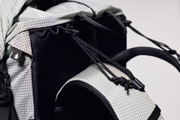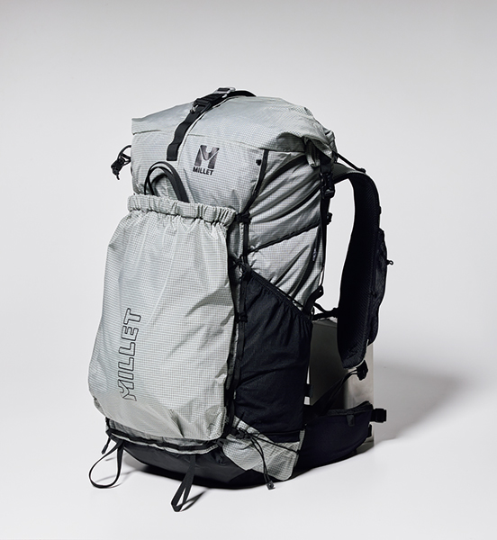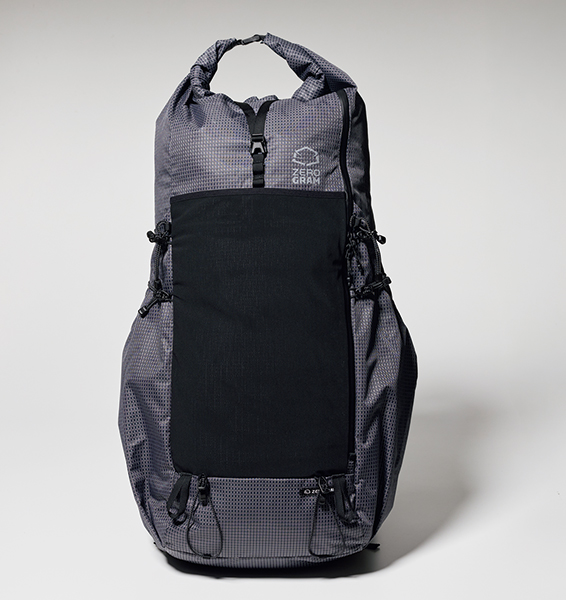 サイドにスリーピングマットも収められる大容量ポケットを装備し、本体自体はコンパクト。開口部はロールトップ式だが、フロントからサイドに長いファスナーが備わり、下部の収納物まで簡単にアクセス可能。フレーム内蔵だが、背中全体で背負う感覚だ。