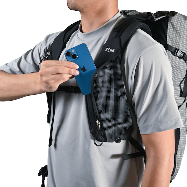 人気のバックパック「ZENN(ゼン)」シリーズと同様に、安定して背負えるようショルダーハーネスは幅広。荷重を肋骨全体に分散するので、歩行時の揺れを軽減し、重い荷物も軽く感じられる。