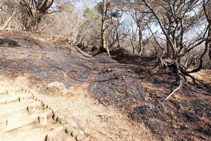 大倉尾根の茅場平と堀山の家の東側の斜面など、標高差150mほどの範囲にわたって焼けた。
