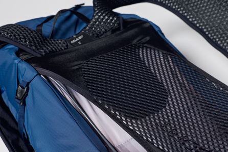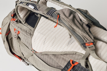 メインルームと仕切られ、前面側ファスナー開閉でアクセスできる寝袋収納用スペースを下部に装備。中型ながら軽量装備でのオーバーナイトも想定。ラダー式の背面長調節機能を新搭載し、薄く細めのショルダーハーネスとともに、動きやすさがアップデートされている。