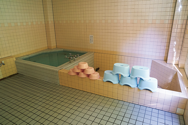 男女別の浴室にはタイル張りの浴槽が2つずつあり、広々としていてシャワーも使える。入浴時間は17時から19時。