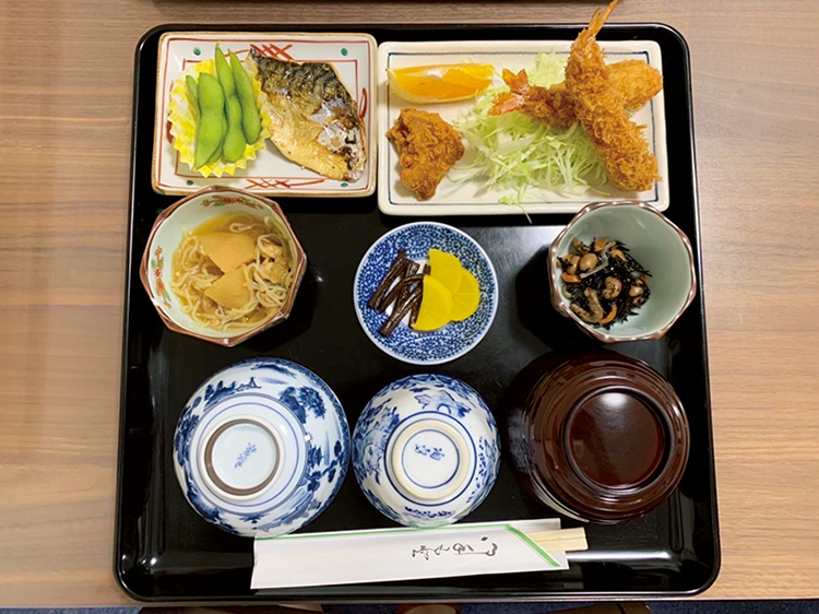 夕飯は肉、魚、野菜と、バランスのとれた献立がうれしい。大きい海老フライが2本と唐揚げ、千切りキャベツにオレンジ、枝豆、サバ、肉じゃが、ひじきの煮物、漬物がずらり。