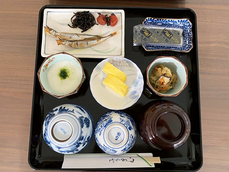 朝食は民宿の朝ご飯風な和食スタイル。玉子焼き2個、切り干し大根の煮物、ししゃも2尾、梅干し、昆布、さらにとろろ芋、味付け海苔が並ぶ。ご飯と味噌汁はおかわり自由。