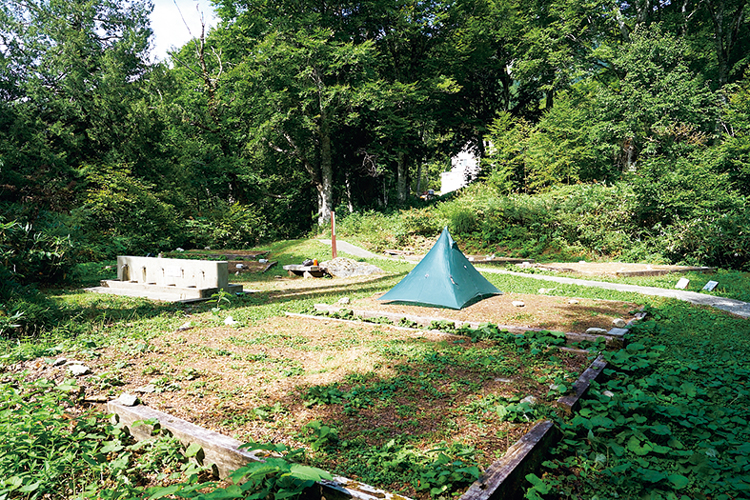 小屋から近い、ダム湖方面に一段下がった遊歩道脇の森のなかに整備されている。木枠で区分けされており、土のフラットなテント場は設営もしやすい。水道と公衆トイレが併設されていて、テント場だけで完結できるのはうれしい。