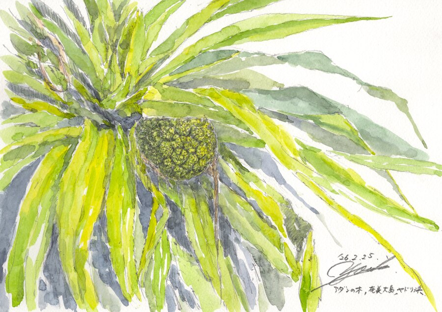 名瀬から瀬戸内までバスで1時間半。さらに小さなバスに乗り継いで、ヤドリ浜に着いたのは14時ごろだった。キャンプ場といっても、海水浴用のトイレと水シャワー、そして静かな砂浜があるだけのすばらしいロケーションである。浜とアダンの森との間に狭いが平らな場所を見つけたのでテントを張った。朝から降っていた雨は上がり、夕方には青空が広がり顔を出した。海峡の向こうに加計呂麻島が島影となって見える。コーヒーを淹れ、さっそくスケッチブックを取り出してテント脇に生えているアダンを描く。波打ち際が近く、最初は落ち着かなかったがそれにも次第に慣れてきた。