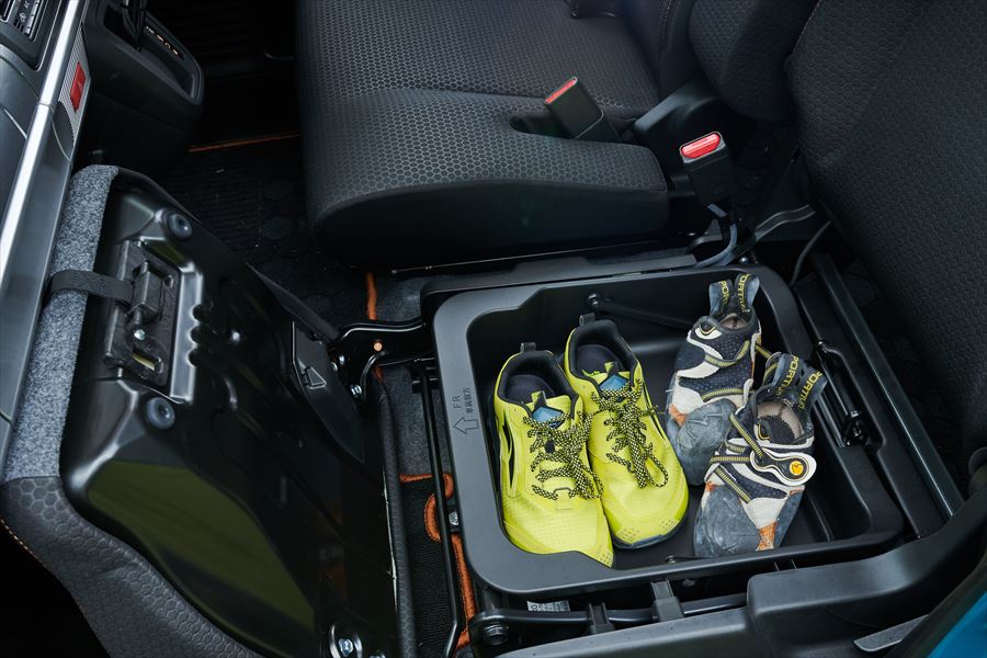 助手席のシート下にはシューズなどを入れておける便利な収納スペースが。持ち手が付いたトレー構造となっており、そのまま取り外すこともできる。