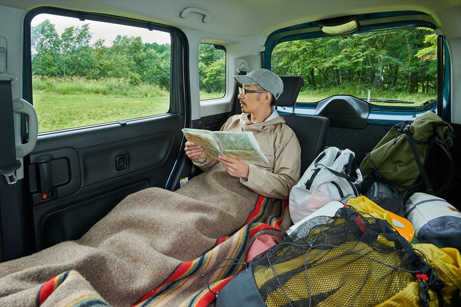 車内で天気待ち。シートアレンジでフルフラットにすればくつろぎの広々空間に。