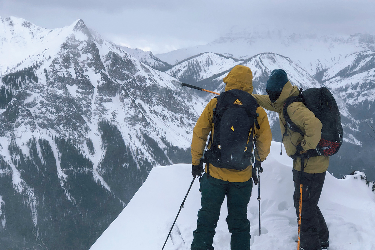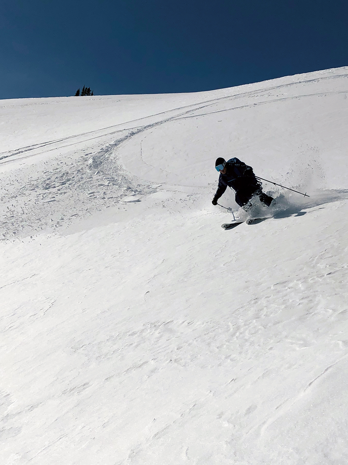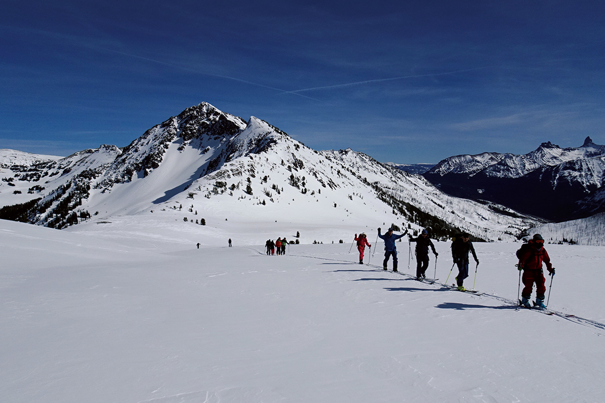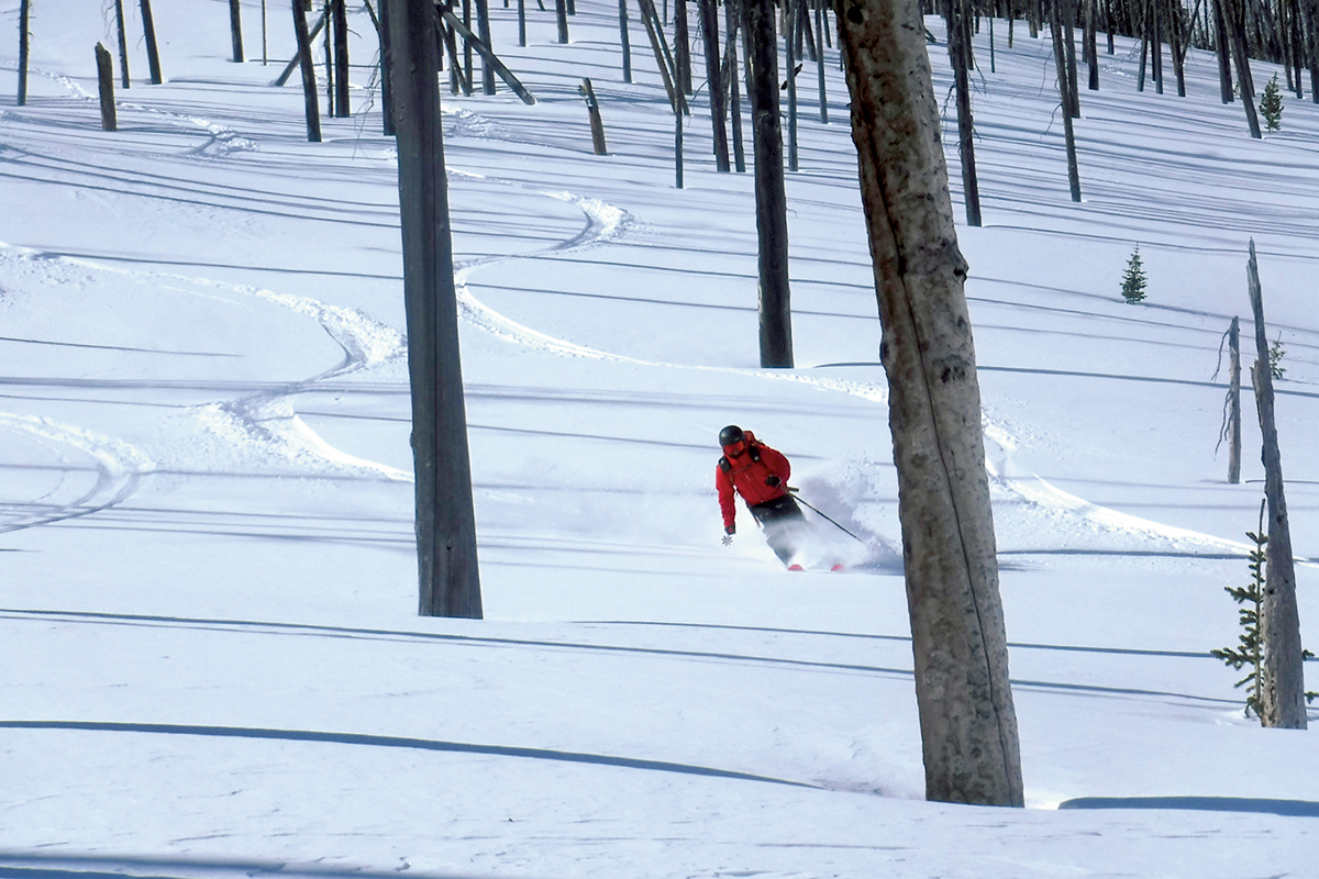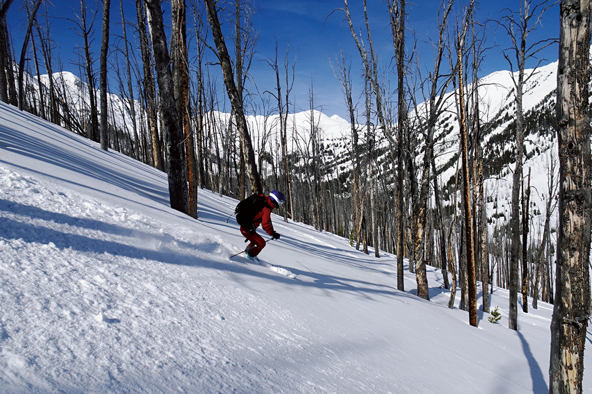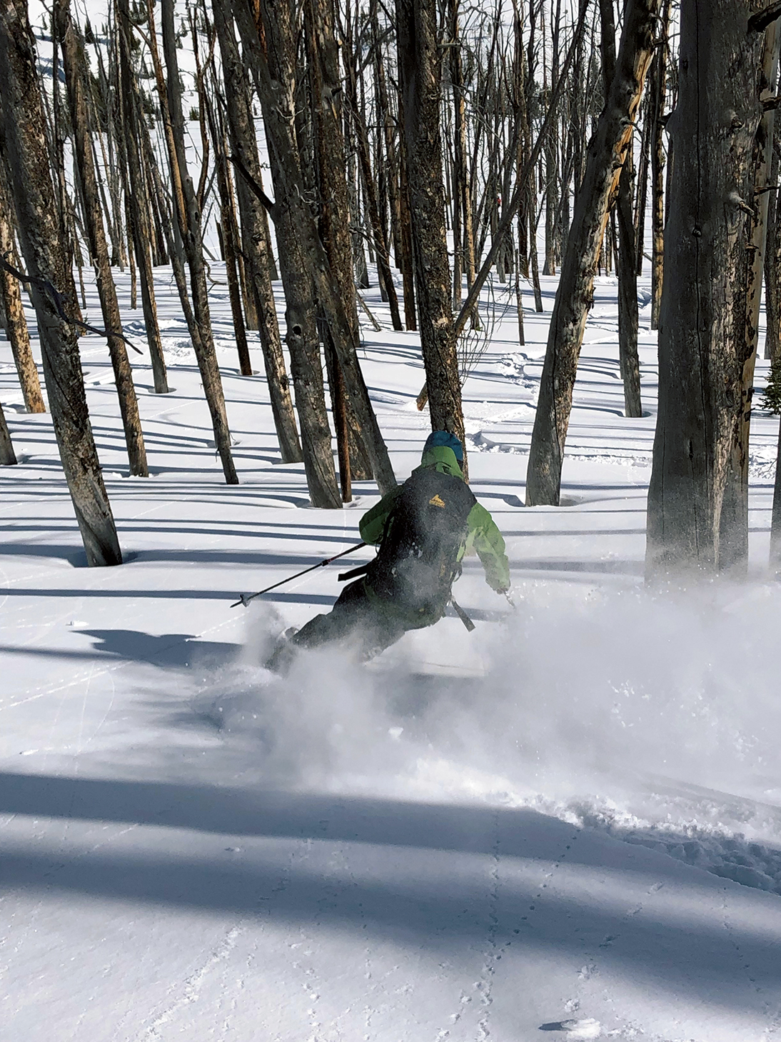 この1本目のスロープは、日本ではまず見ることのない山火事によって立ち枯れた針葉樹の森。我々にとってはとても新鮮で独特な雰囲気だ。モンタナを含め北米全体が抱える森林火災の問題はいったん横に置いておき、幻想的な風景のなかリッジラインまでハイクアップし、ひとしきり山々の景色を楽しんだあと、ドロップイン。昨日の降雪のおかげで最高のパウダーランでこの日のスタートを切った。