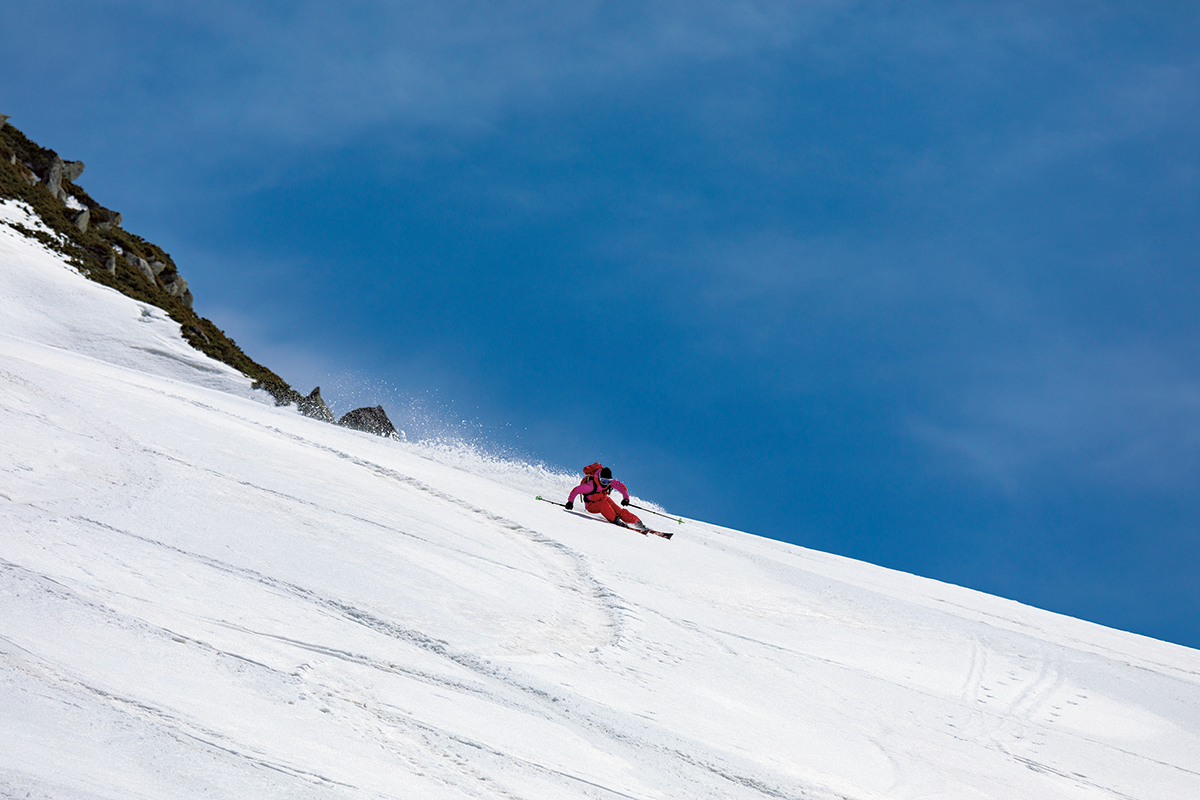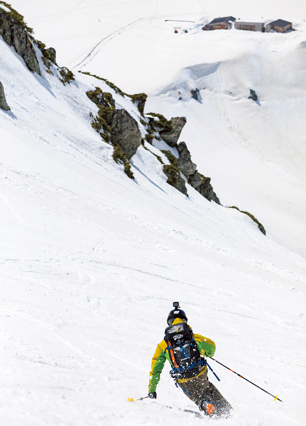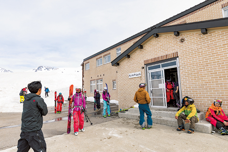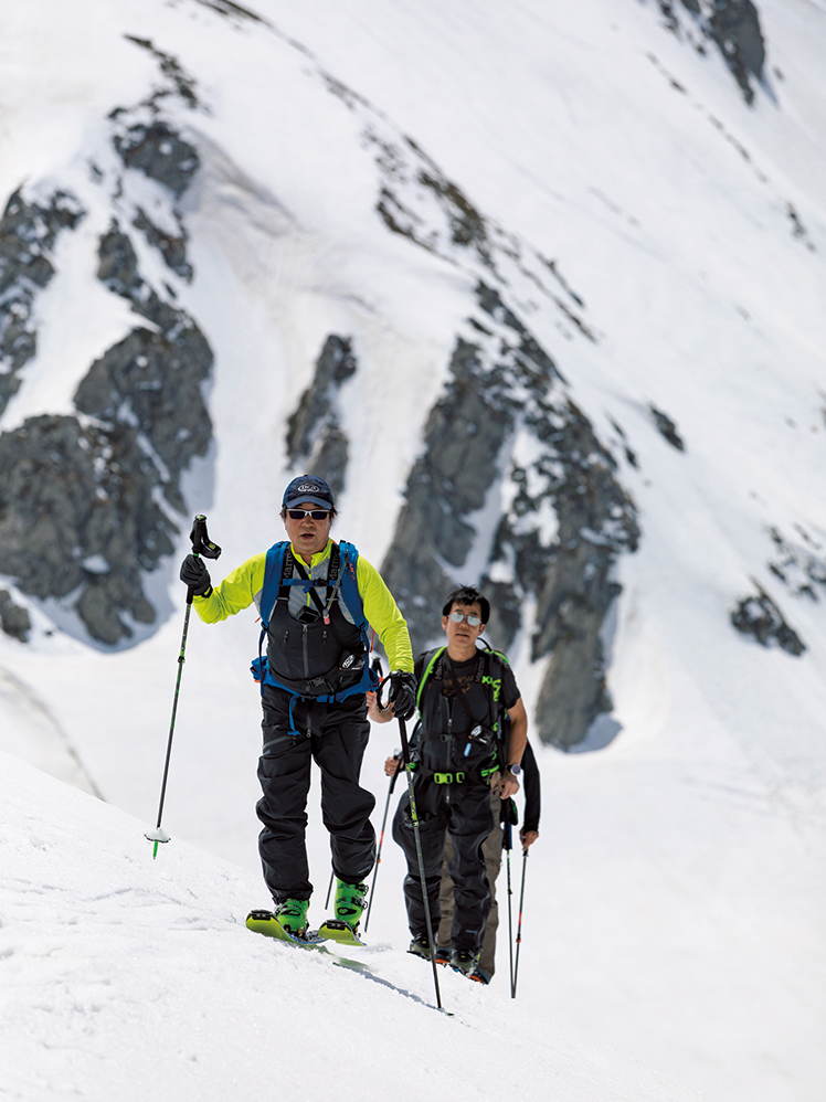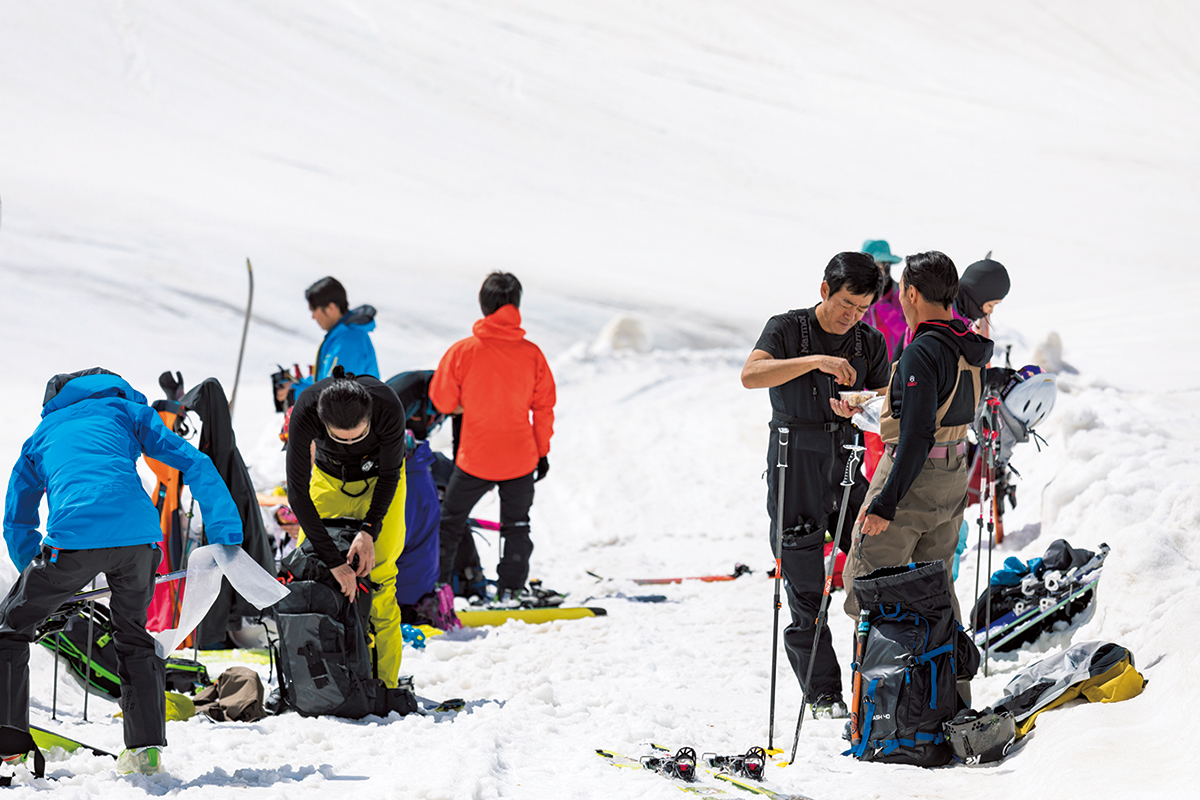 参加する「K2立山天狗クラシック」のガイド陣の姿を見つけると、早足でその方向へと歩いていった。このイベントには、ガイドやプロスキーヤーたちとともに出かけることで、アルパインエリアが広がる立山でのバックカントリースキーをより身近に感じてもらいたいという思いが込められている。立山の気象は森林限界以下のエリアに比べて厳しく、ひとたび天候が悪化すれば激しい風雪に見舞われる。より確かな安全性確保のための技術と経験が必須になるが、現地を熟知したガイドと行動をともにすることで、より安全で快適に、この山域を楽しんでもらおうと企画されたのだ。