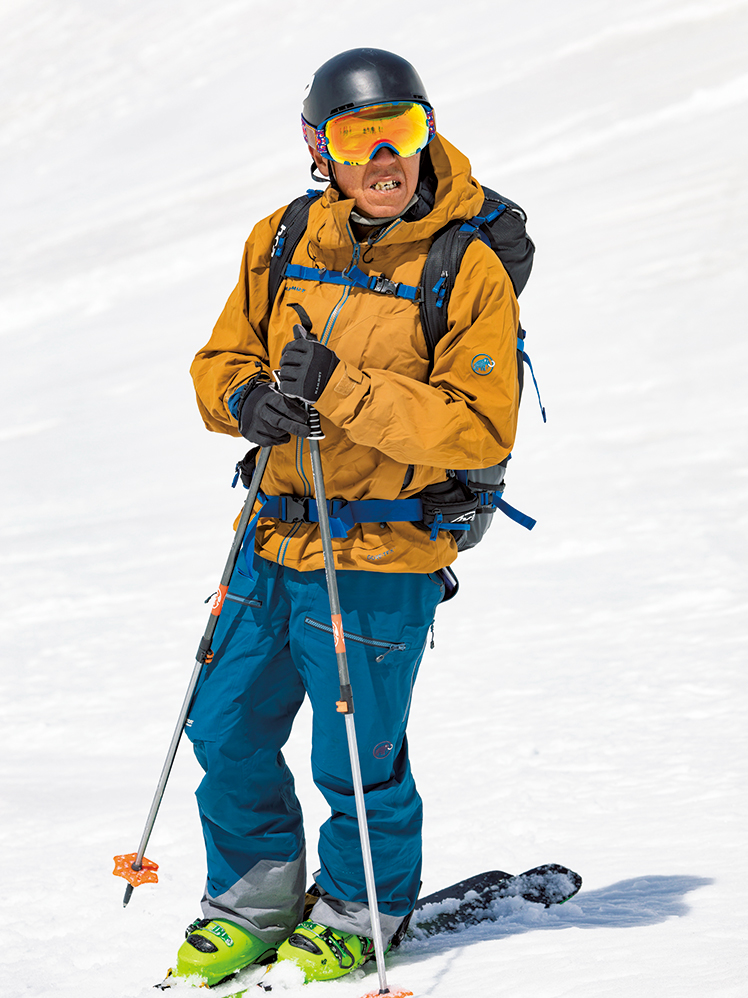 山崎カール手前の平地で休憩していた僕たちは、堀江淳さんの一声でふたたび歩を進め、最後の急斜面を上りつめていく。そして、ローソクのような岩の麓へとたどりつくとクライミングスキンを剥がし、ゴーグルやヘルメットを装着した。