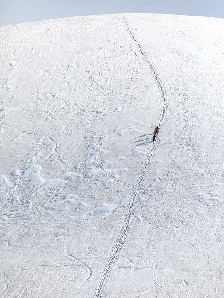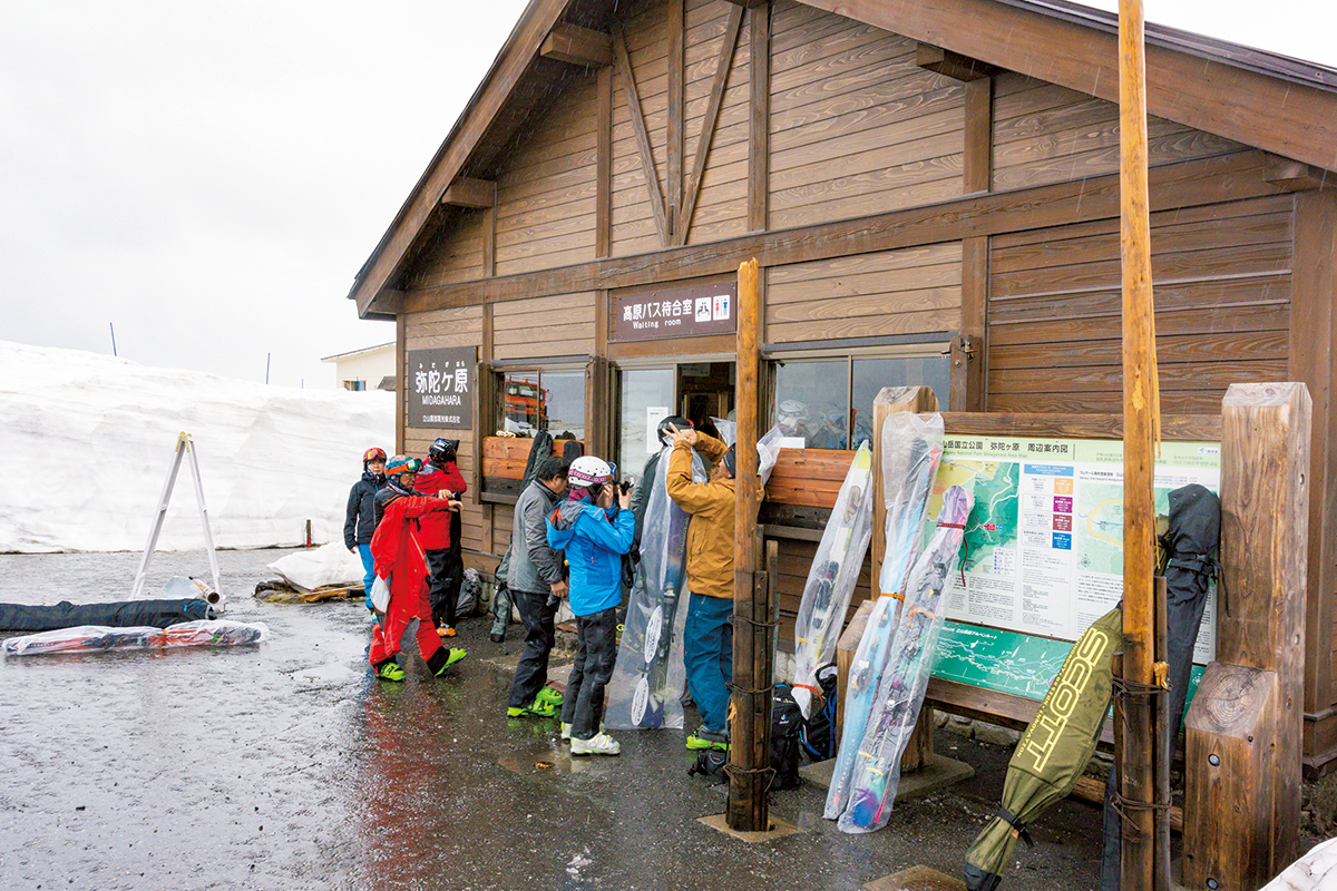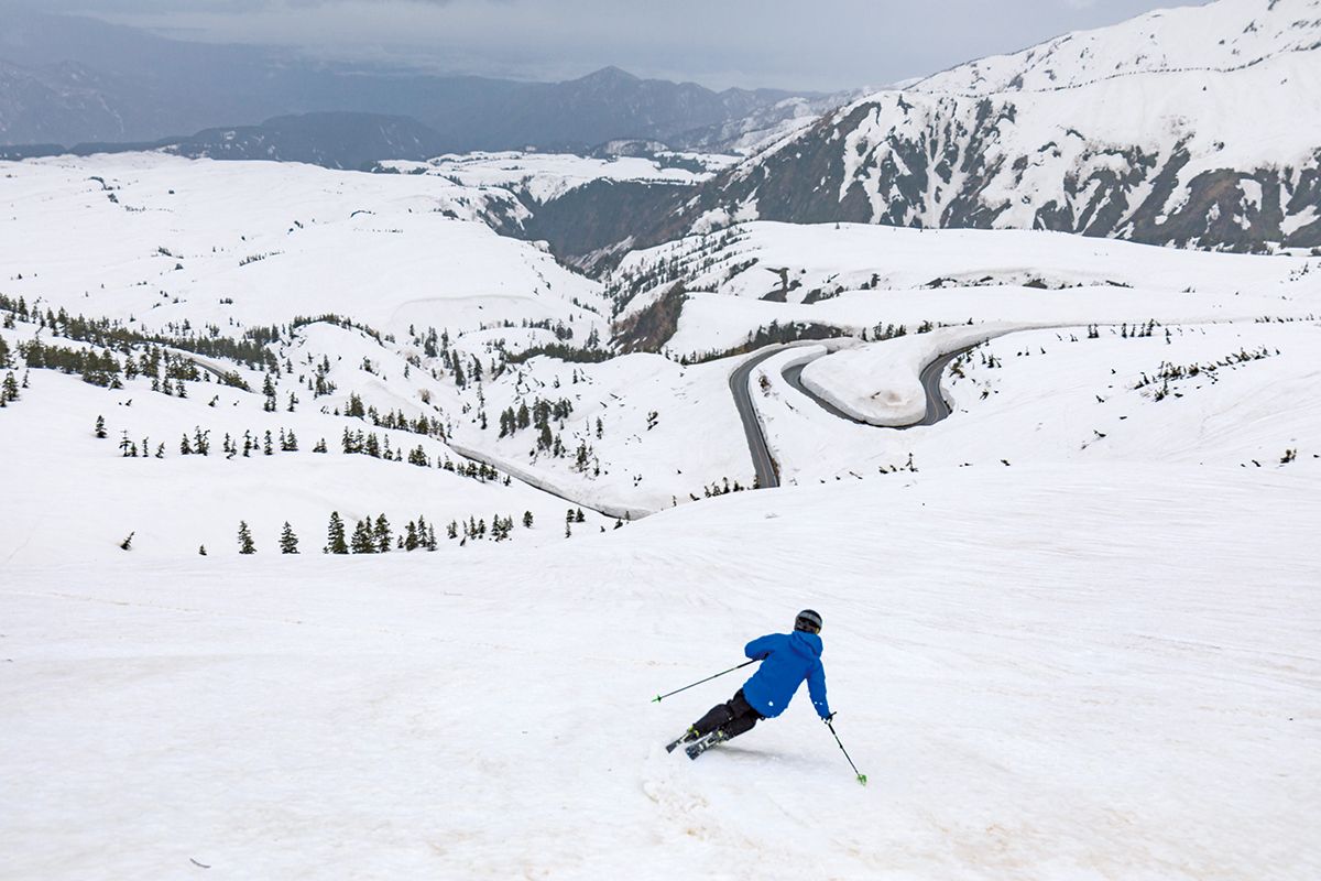 先頭で斜面へと滑り込んだのは江本悠滋さんだった。みながその姿に注目するなか、ほどよく緩みはじめた雪面を力強く滑り降りていく。そのあとを追って、ひとり、またひとりと滑り降りていき、ひとまとめに集合していく。そこから、またさらに標高を落としていって、今度は夏道をたどるようにして室堂平へと登っていった。