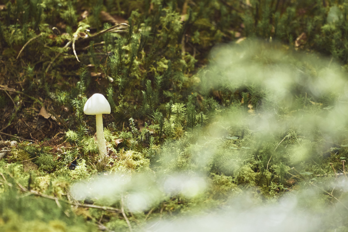 ▲木漏れ日が美しい苔むす森。にょきっと伸びるキノコも、目を楽しませてくれた。