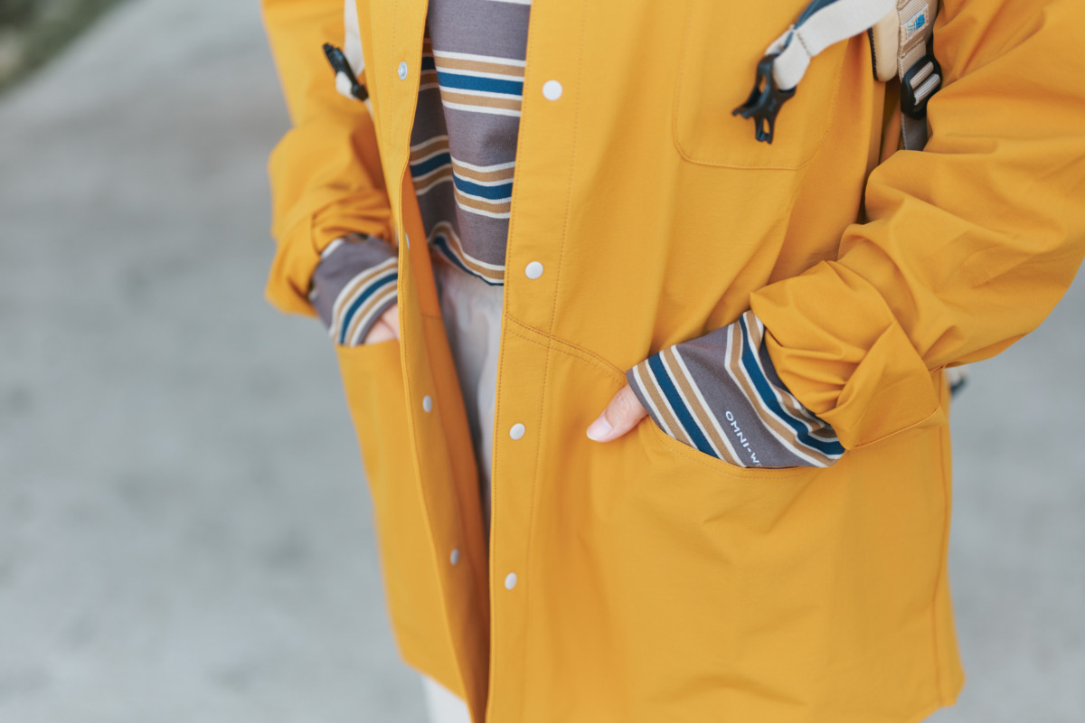 今回の主役は、アトリエブルーボトルのハイカーズシャツ。全方向ストレッチの効いた生地は速乾性に優れ、スナップボタンで着脱もラク。バンドカラーのデザインは、街にも日常にも活躍します。オーバーサイズを選んだら、太目のパンツと合わせるのがおすすめ。インナーのTシャツはパンツにインすると、バランスよく着ることができます。