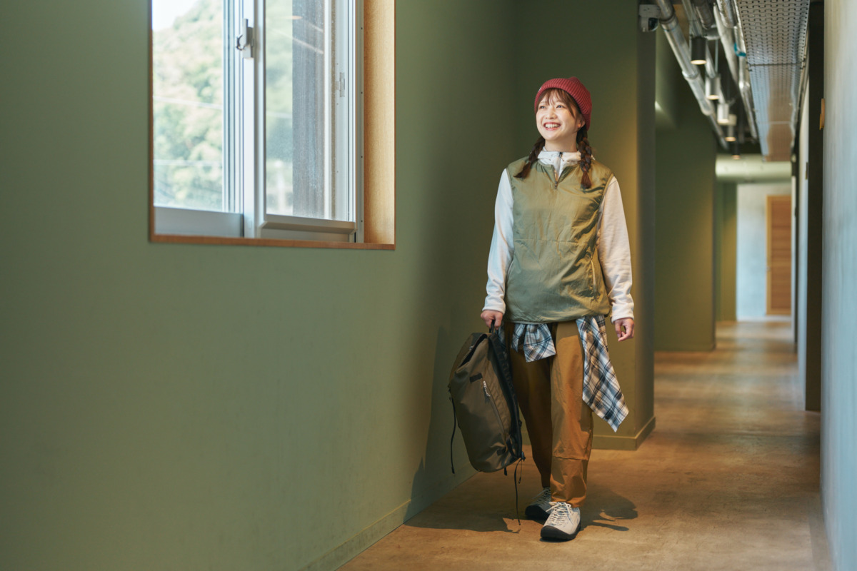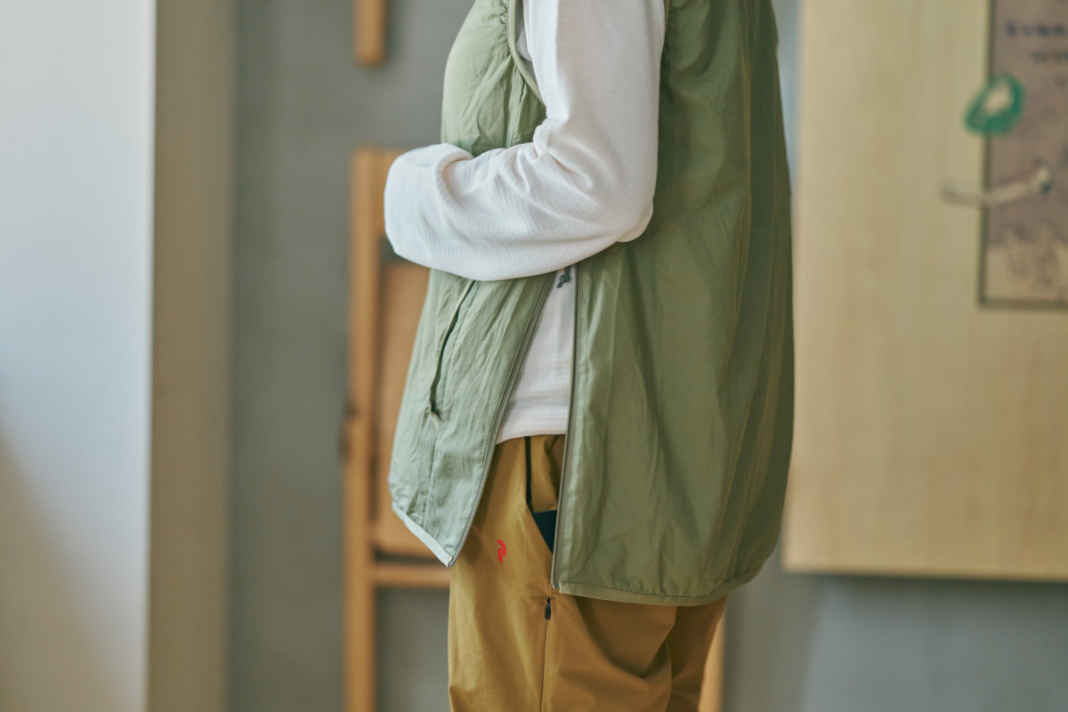 今回の主役は、アクシーズクイン エレメンツのオクタライニングのベスト。表地には通気性に優れるリップストップナイロン、裏地には保温性に優れるふわふわ素材のオクタを採用。軽量なため、旅先での防寒着としても一枚忍ばせておきたいアイテムです。秋色のパンツとニット帽、ポイントにもなるチェック柄シャツをプラスすれば、オータムカラーコーデが完成。