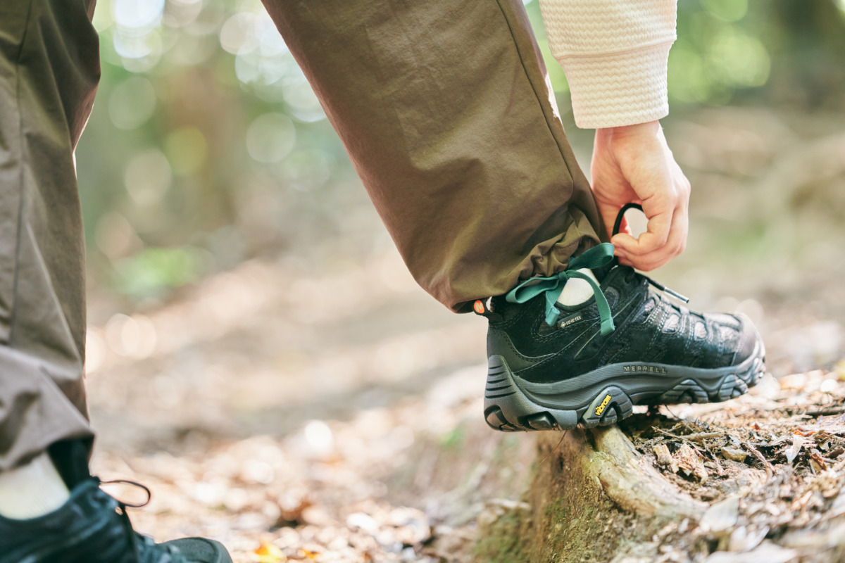 足首の紐をきゅっと絞ることで、さまざまな表情を楽しめます。パンツのカラーによって異なる紐の色がポイントに。真冬の低山歩きでは、パンツの下に一枚タイツを重ねるのがおすすめです。