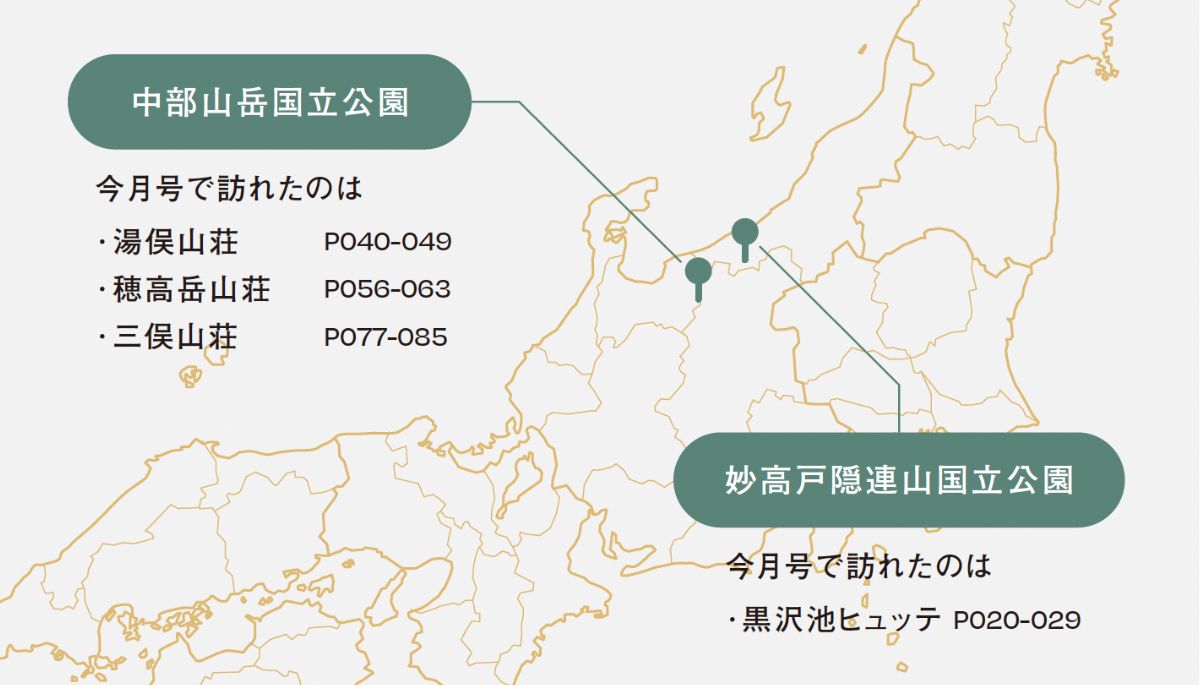 ランドネ最新号では、「中部山岳国立公園」「妙高戸隠連山国立公園」で訪れた山小屋の情報も掲載!旅の計画が、きっともっと楽しくなるはずです。