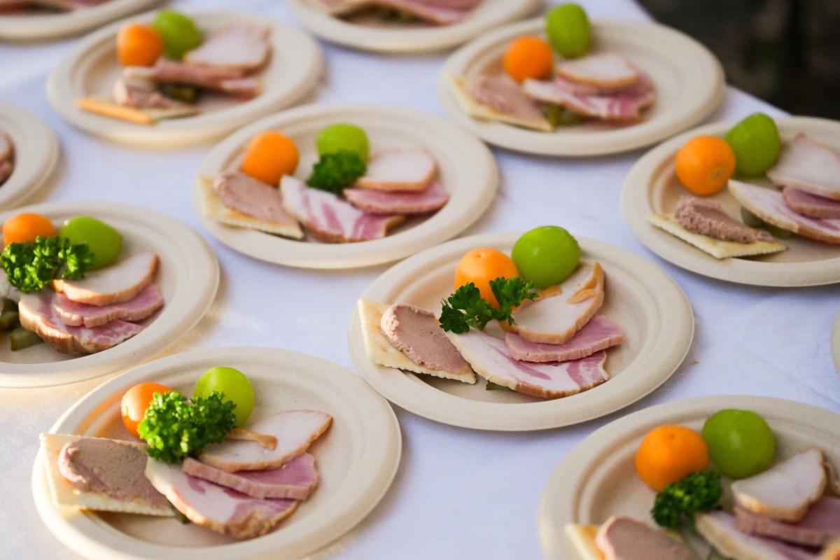 はじめに提供されたのは、スモークチキンや豚ヒレのハム、諏訪美豚のローストハム、レバーペースト、シャインマスカット、旬のホオズキ